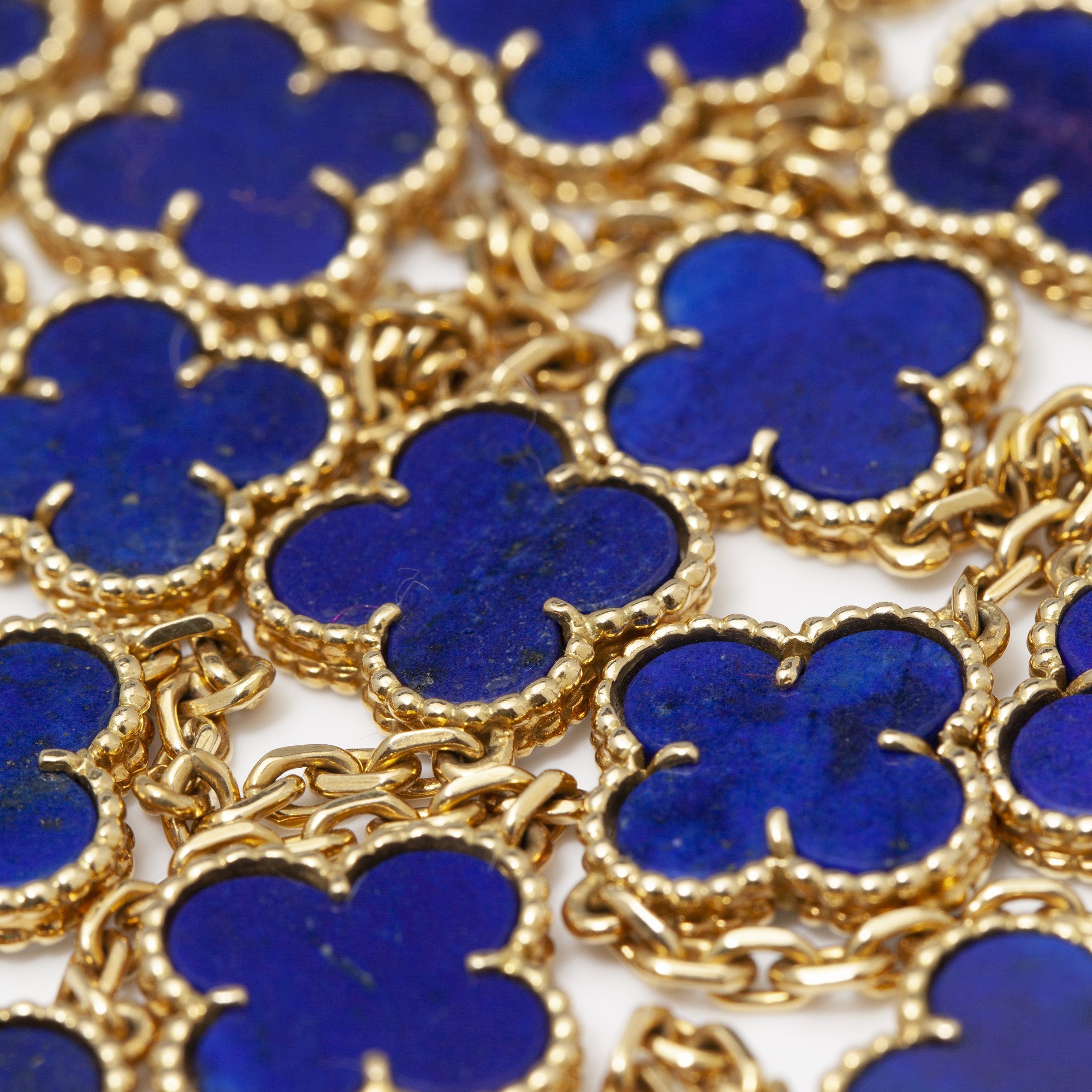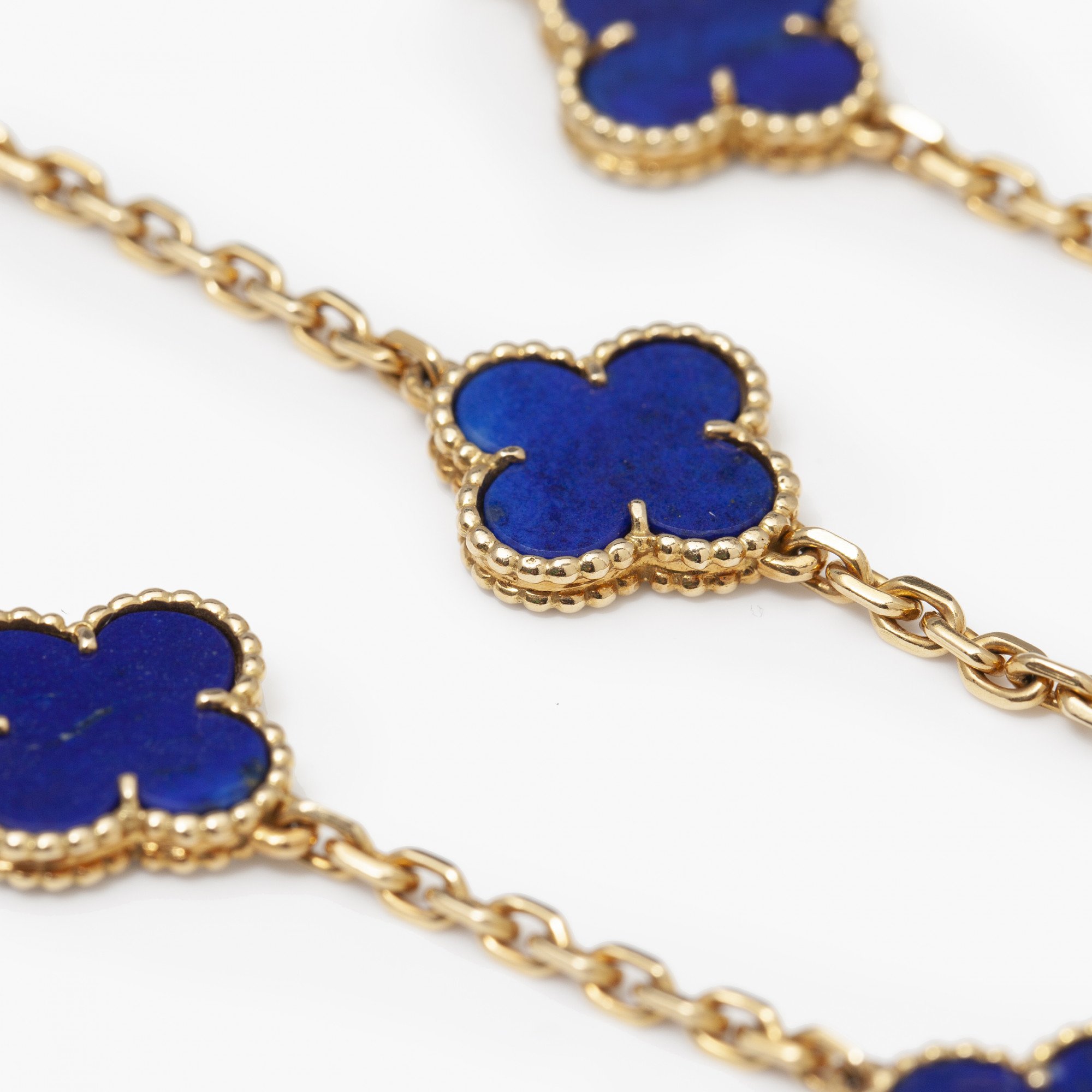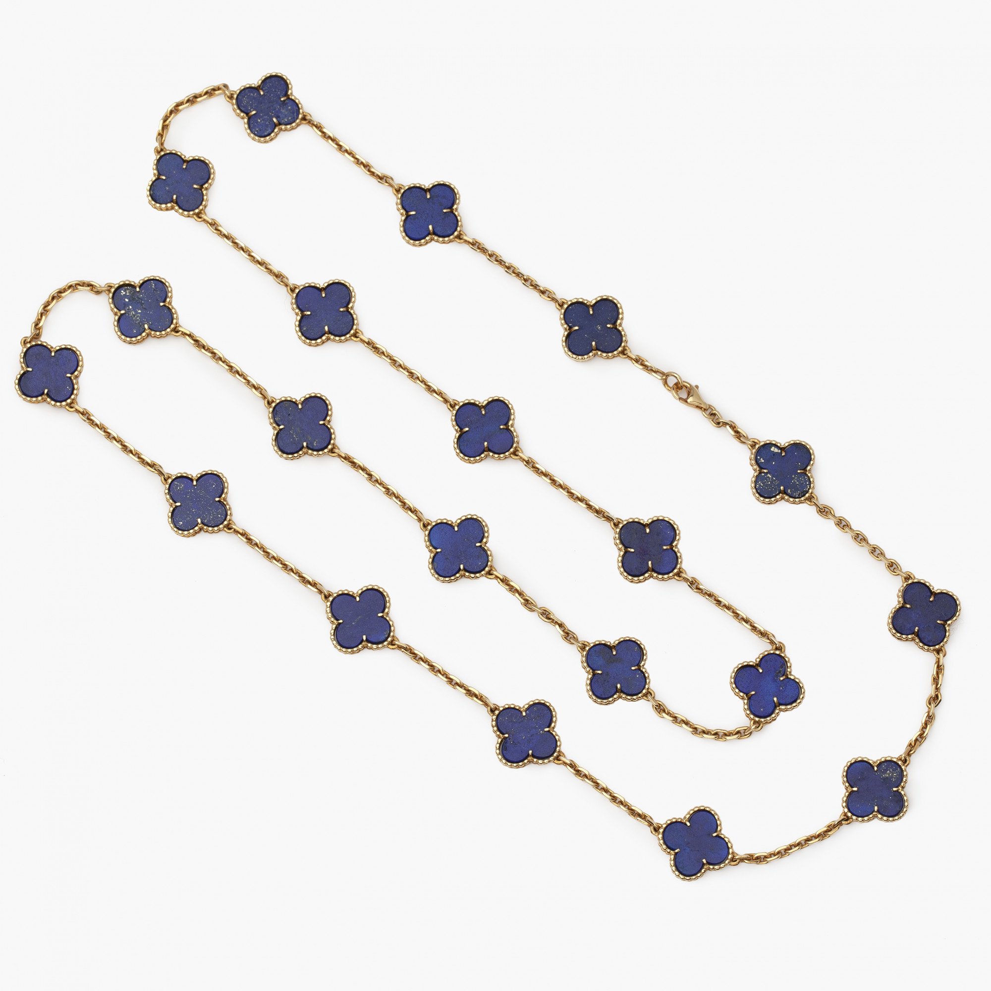 Een achttien karaat geelgouden “Alhambra” sautoir bestaande uit een geslepen ankercollier waartussen op gelijke afstand totaal twintig zgn. “Alhambra”-motieven gesneden uit lapis lazuli waar omheen een parelrand, met een veerring als sluiting. Gesigneerd Van Cleef & Arpels en genummerd. Vervaardigd in Parijs, omstreeks 1970.