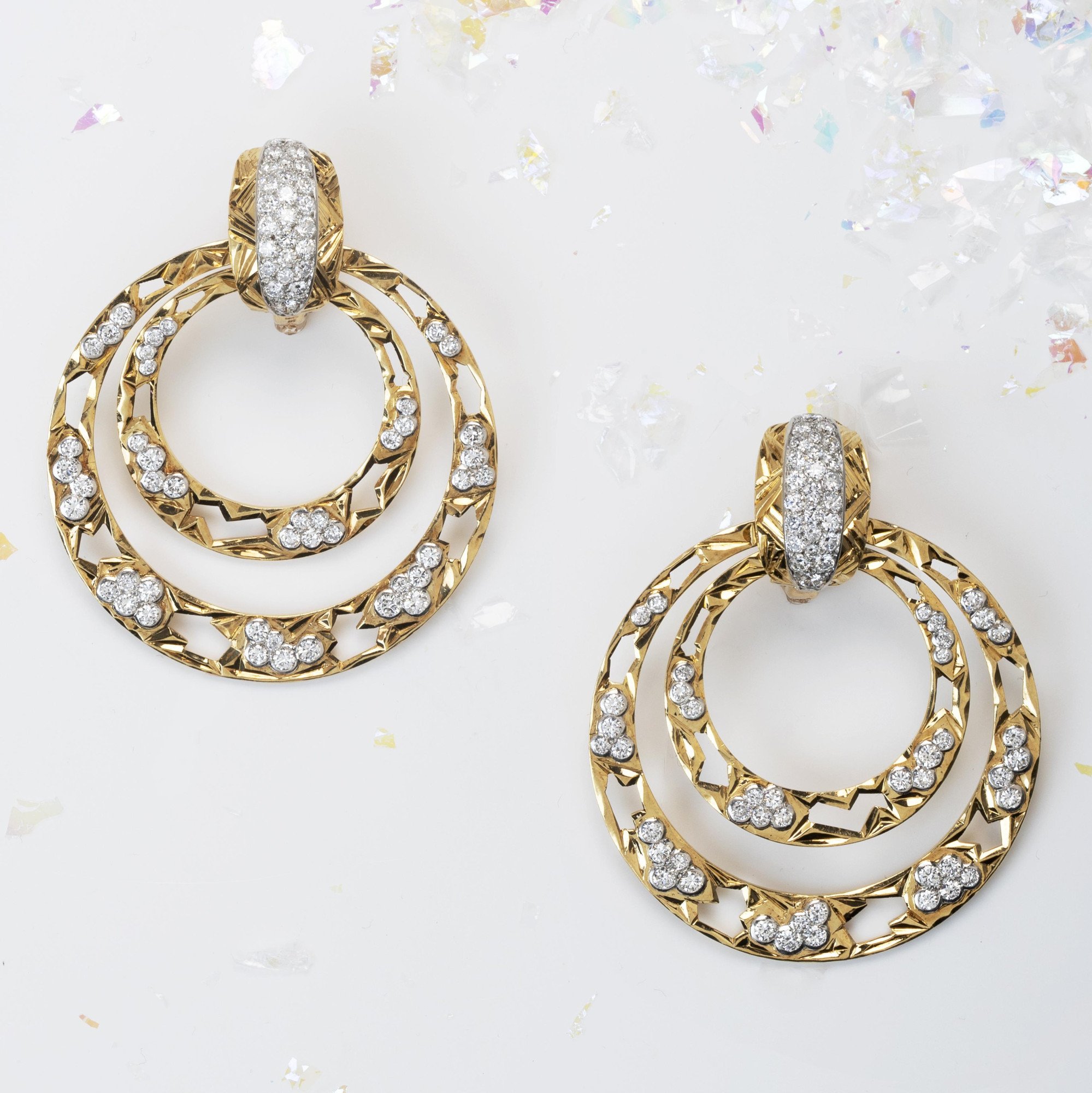 Een paar achttien karaat geelgoud en platina zgn “doorknocker” oorbellen, elk bestaande uit twee ajour gezaagde bewegende ringen, deels bezet met diamanten, aan een brugvormige oorclip. Gesigneerd Cartier Paris en genummerd, vervaardigd omstreeks 1970.