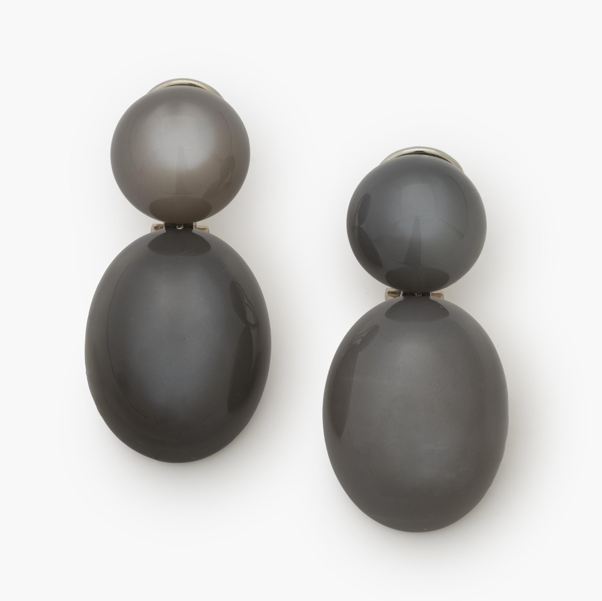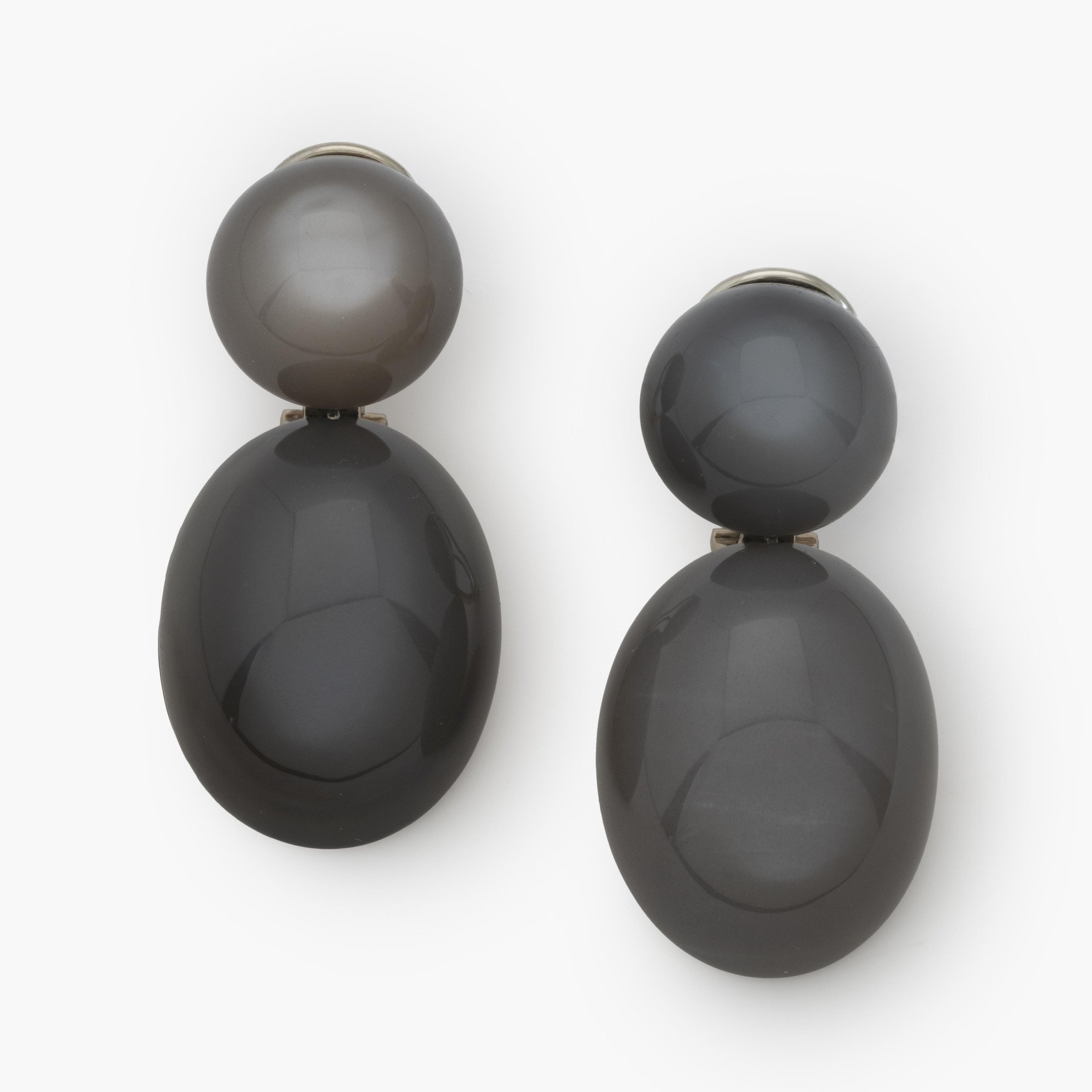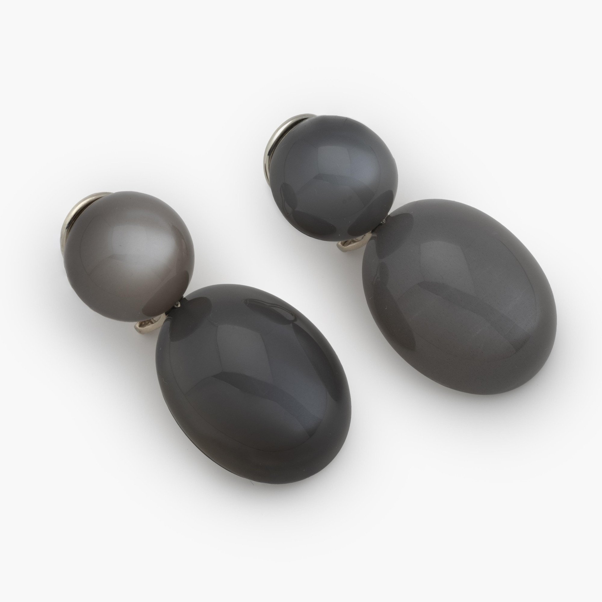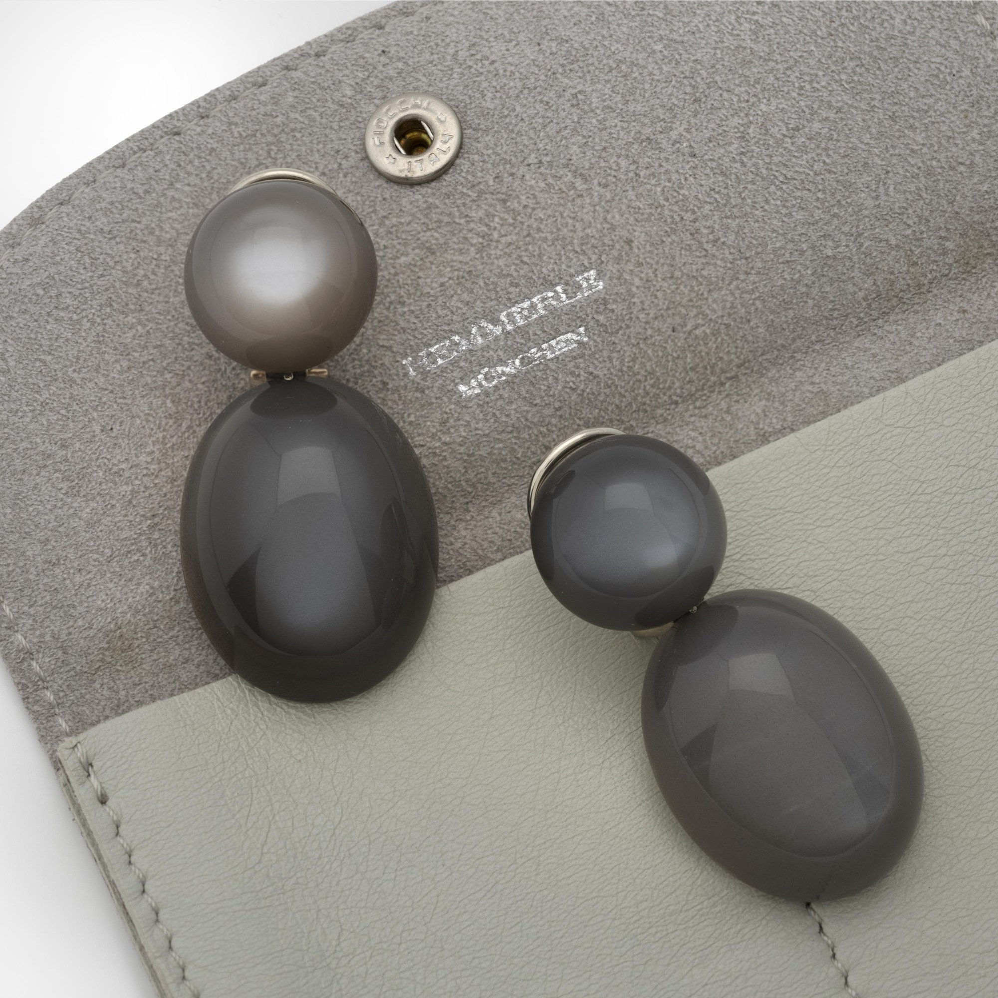 Een paar achttien karaat witgouden oorbellen, bezet met grijze maanstenen in verschillende tinten; twee ronde op het oor en hieronder scharnierend gemonteerd twee ovale. Gesigneerd Hemmerle, vervaardigd in München. Met originele pouch.