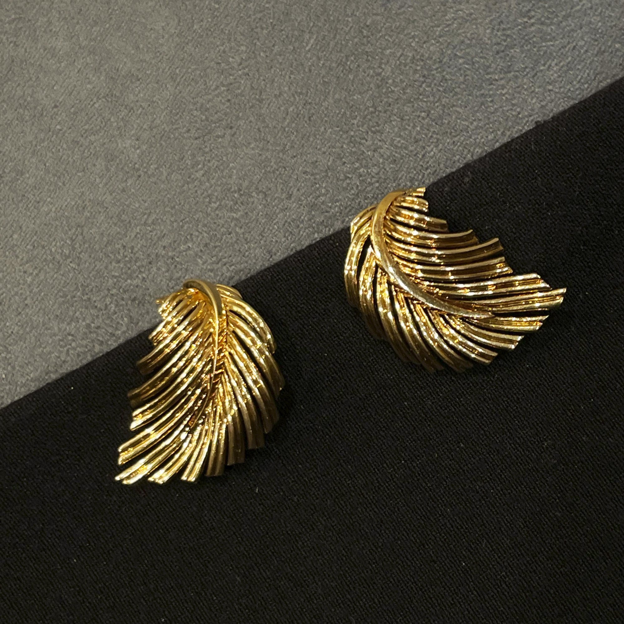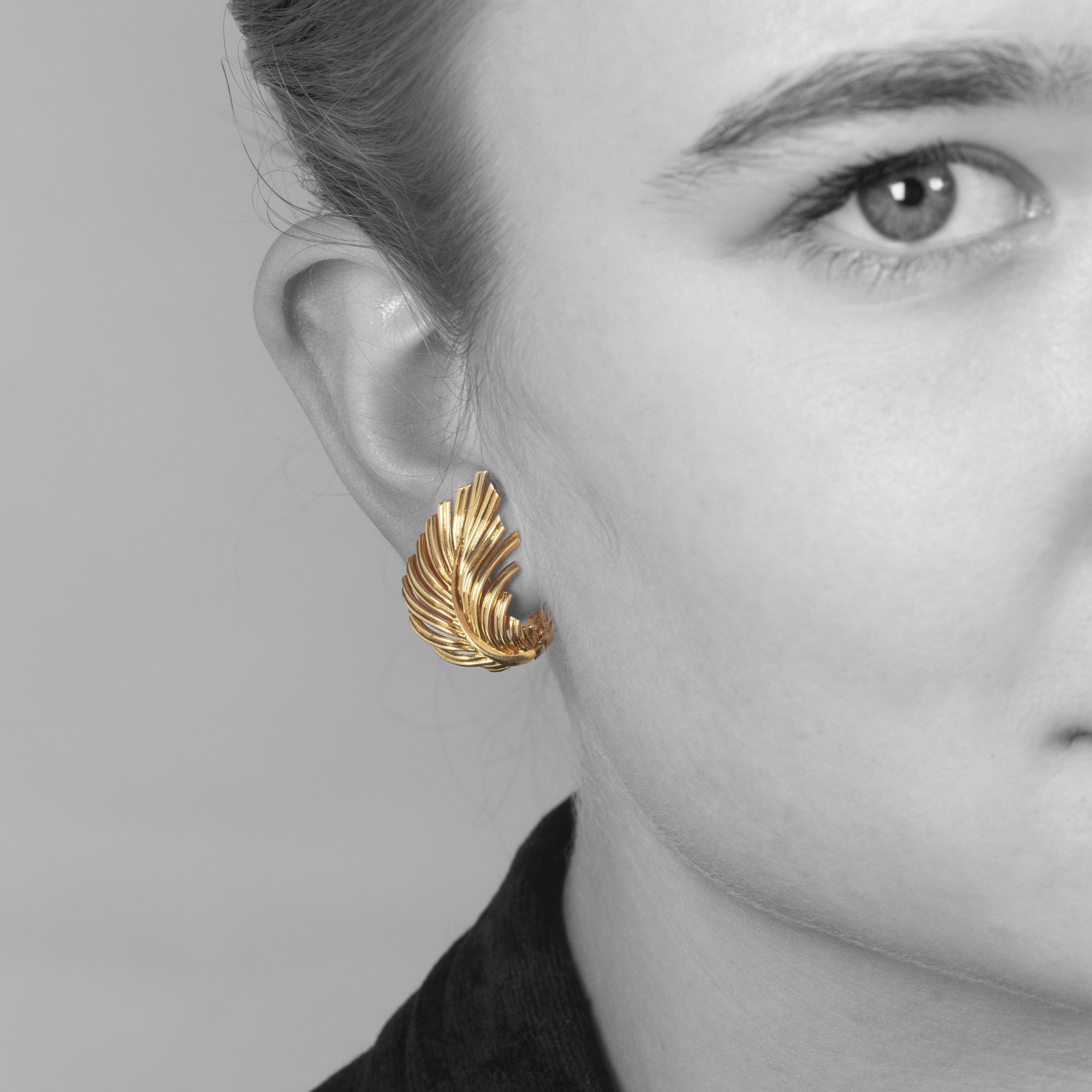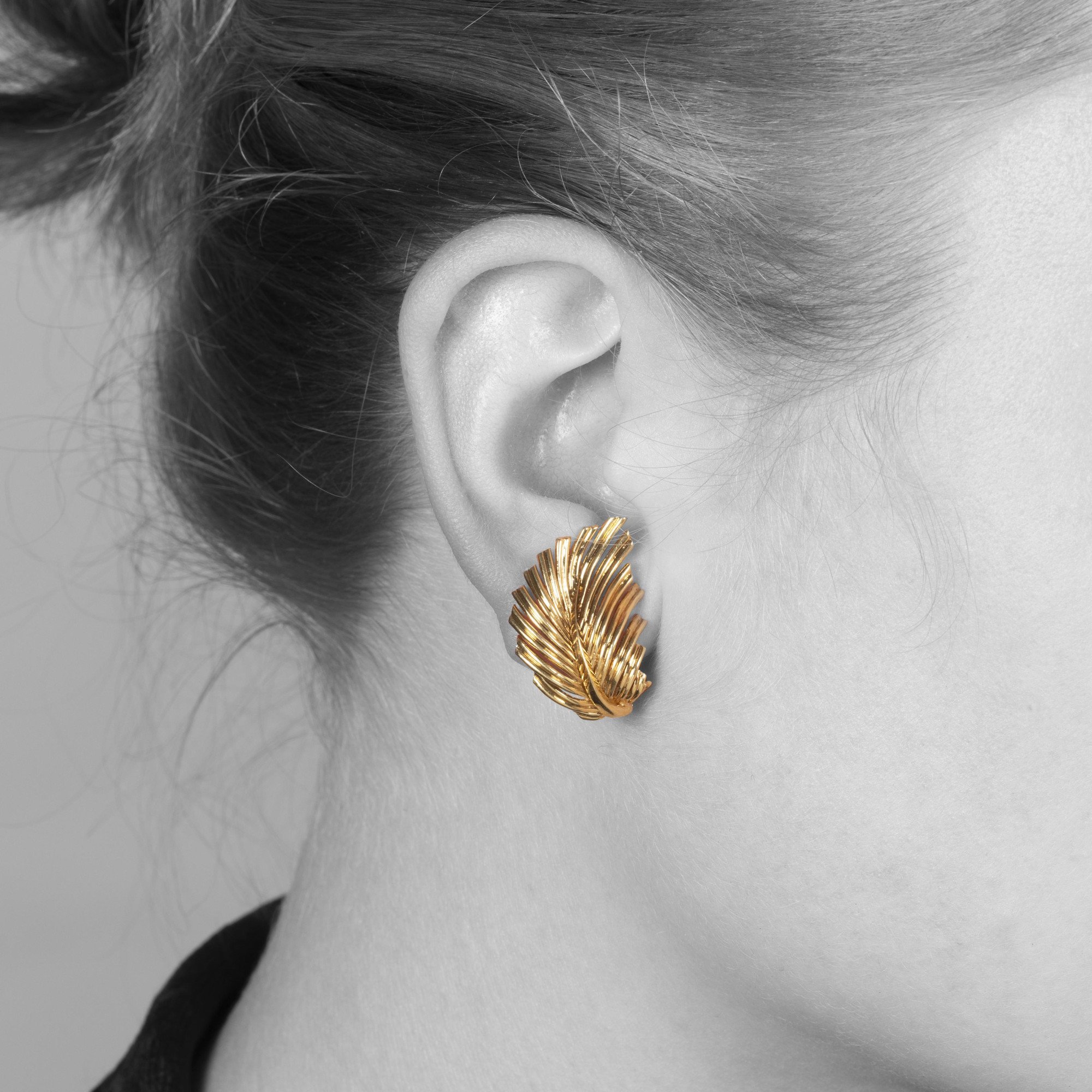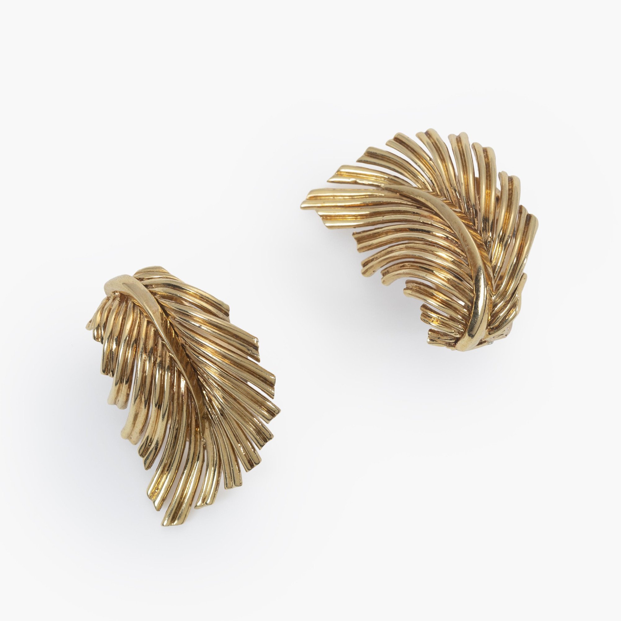 Een paar achttien karaat geelgouden oorclips, elk in de vorm van een veertje. Met uitklapbare veiligheidspin waardoor de veertjes ook als dress clips gedragen kunnen worden. Gesigneerd Van Cleef & Arpels, vervaardigd in Parijs, omstreeks 1960. Beide genummerd.