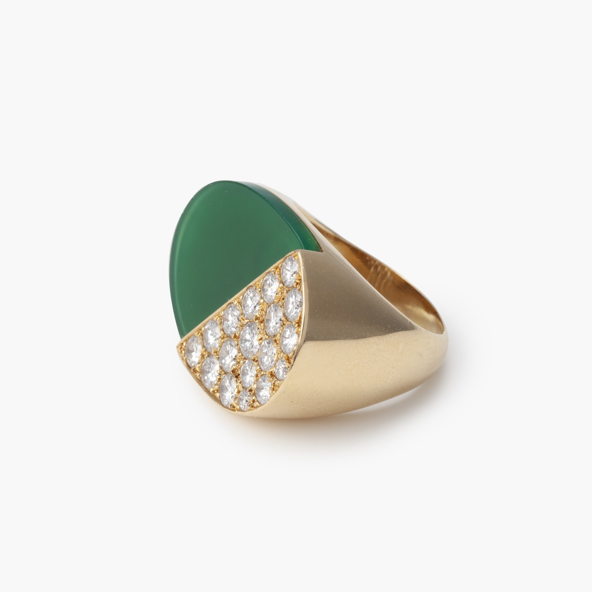 Een achttien karaat geelgouden ring waarvan de bovenzijde diagonaal is doorsneden, de ene zijde verlaagd ingelegd met groene agaat, de andere verhoogd pavé bezet met briljant geslepen diamanten. Gesigneerd Cartier, vervaardigd in Parijs, omstreeks 1980.