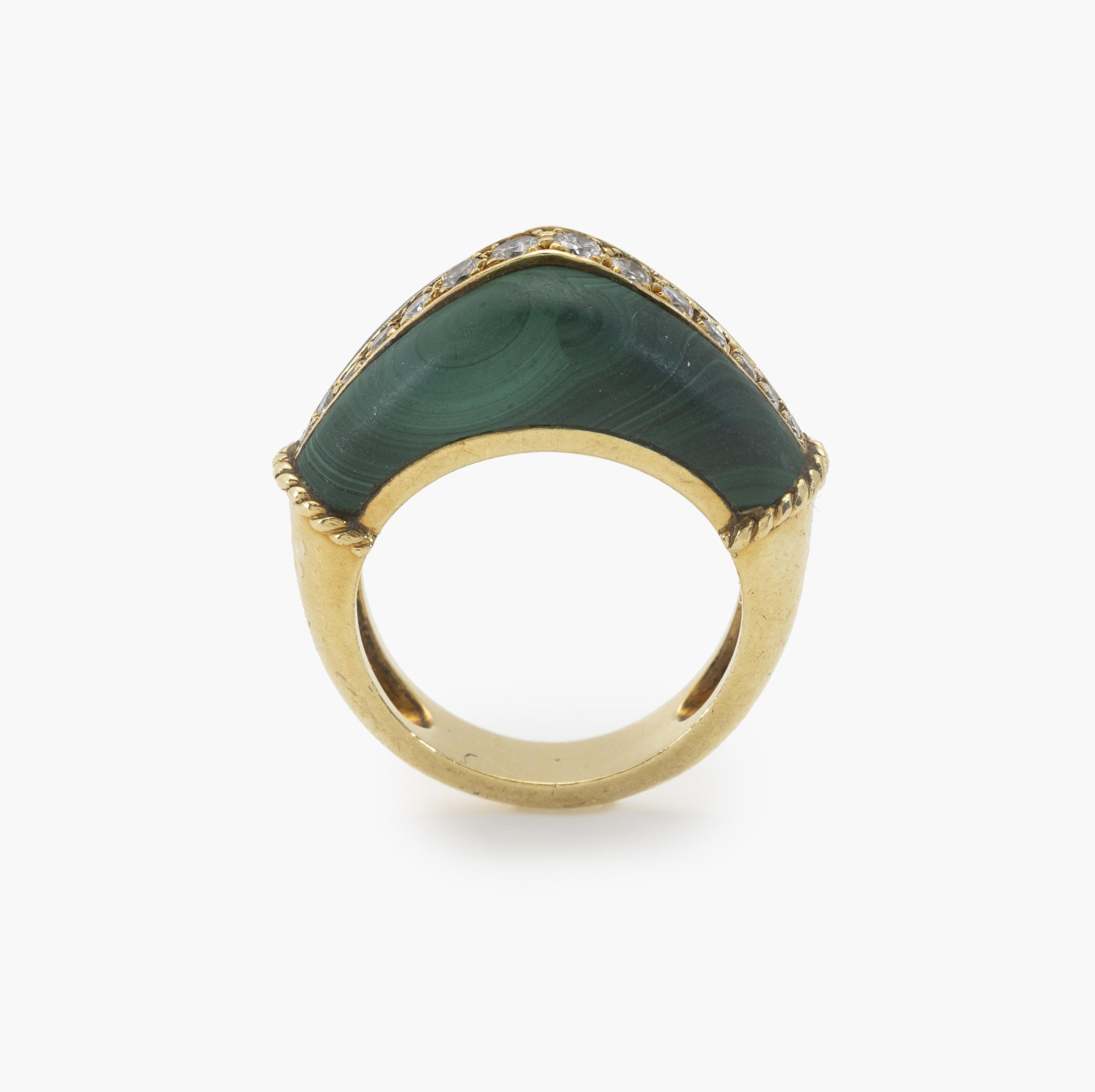 Een achttien karaat geelgouden ring bezet met malachiet, centraal ingelegd met een  gouden band, pavé gezet met briljant geslepen diamanten. Gesigneerd Cartier en genummerd, vervaardigd in Parijs, omstreeks 1980. Met origineel etui.