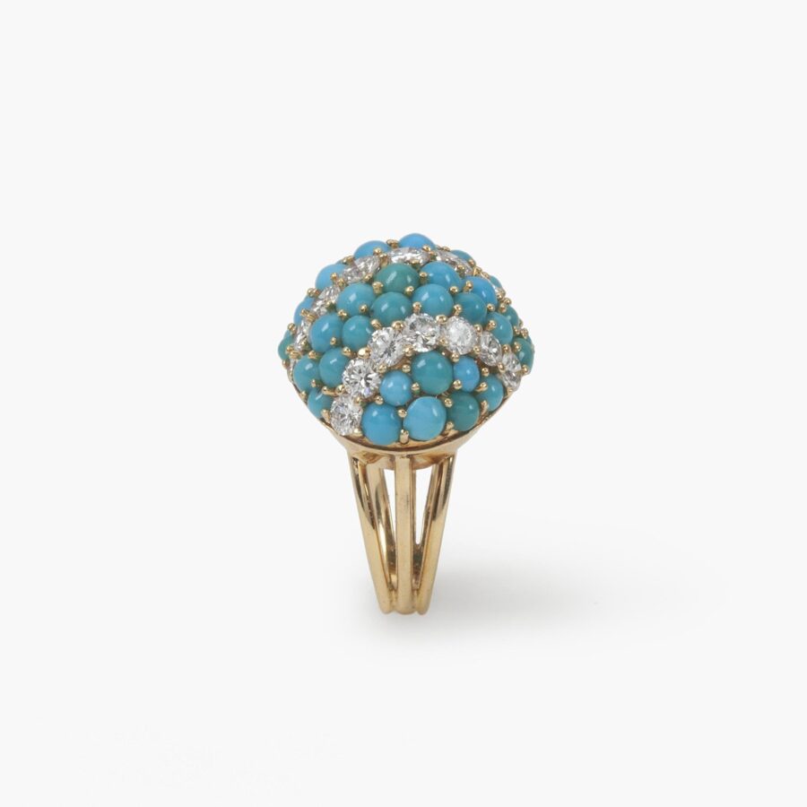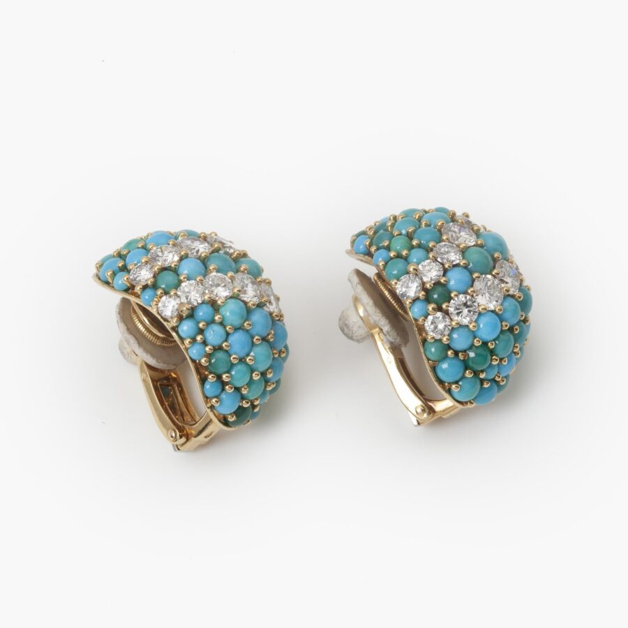 Een achttien karaat geelgouden bolle armband bezet met ronde cabochon geslepen turkoois, hiertussen vijf diagonale banen bezet met een briljant geslepen diamanten. Bijpassend een paar achttien karaat geelgouden ovale bolle oorclips, ook bezet met ronde cabochon geslepen turkoois en briljant geslepen diamanten in twee diagonale banen. Allen met meesterteken van Georland, Parijs. Ook bijpassend een achttien karaat geelgouden bombé ring geheel bezet met ronde cabochon geslepen turkoois en briljant geslepen diamanten in drie diagonale banen. Toegeschreven aan Georland, Parijs. Vervaardigd omstreeks 1960.